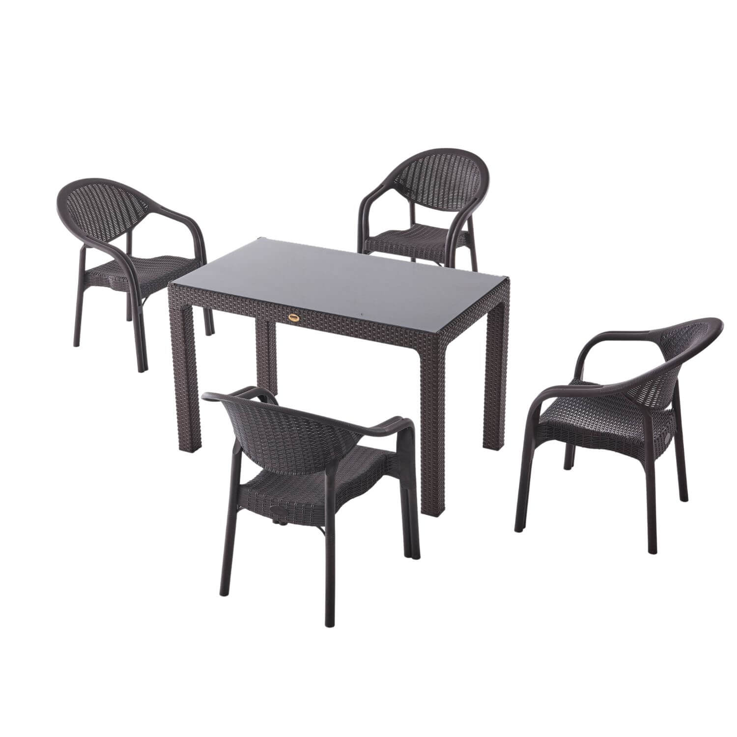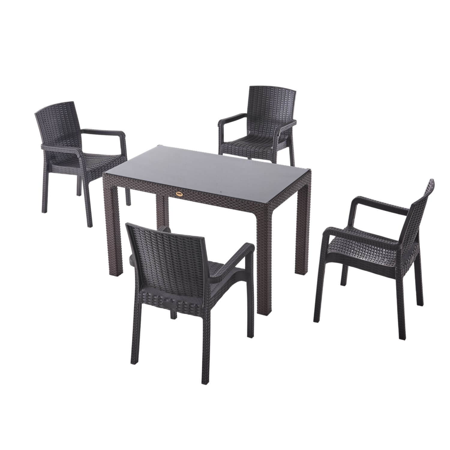 Masa este realizată din plastic durabil, rezistent la intemperii, care imită ratanul. În plus blatul de sticlă aduce o notă de lux în spațiul de exterior.