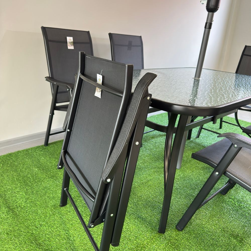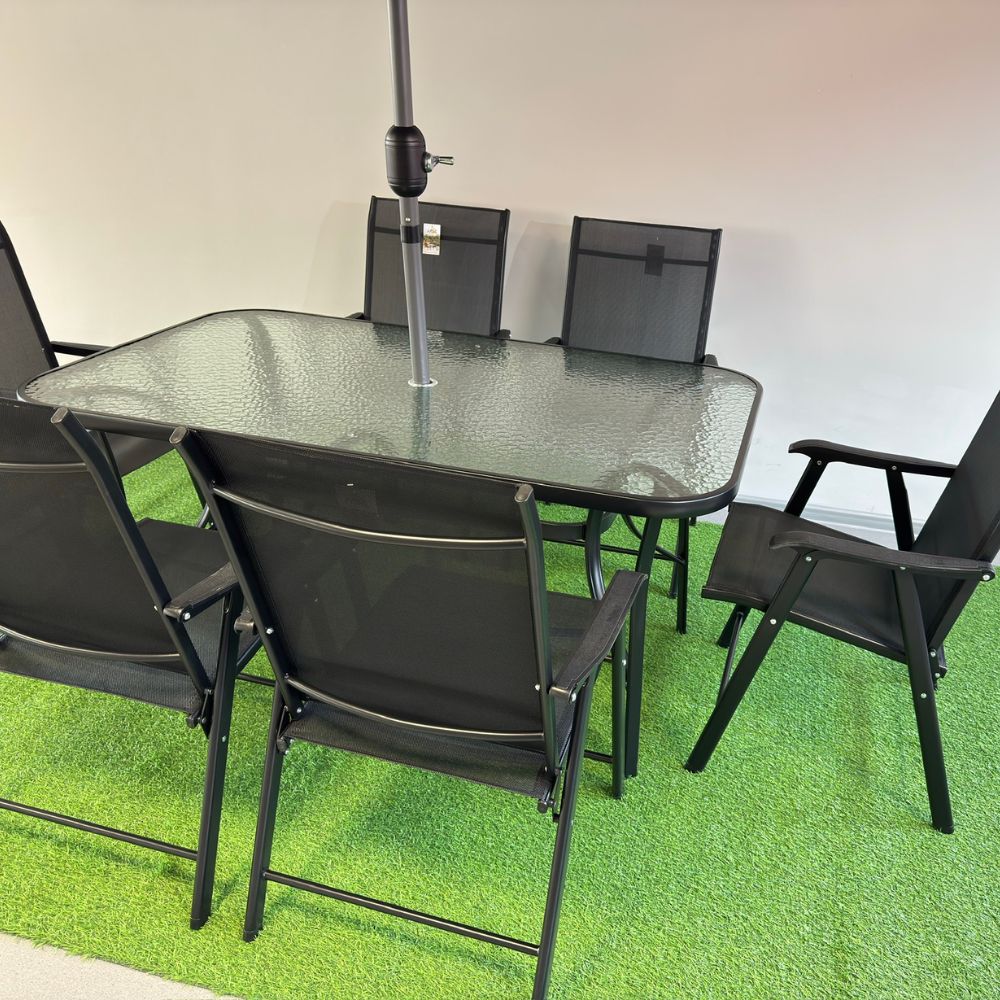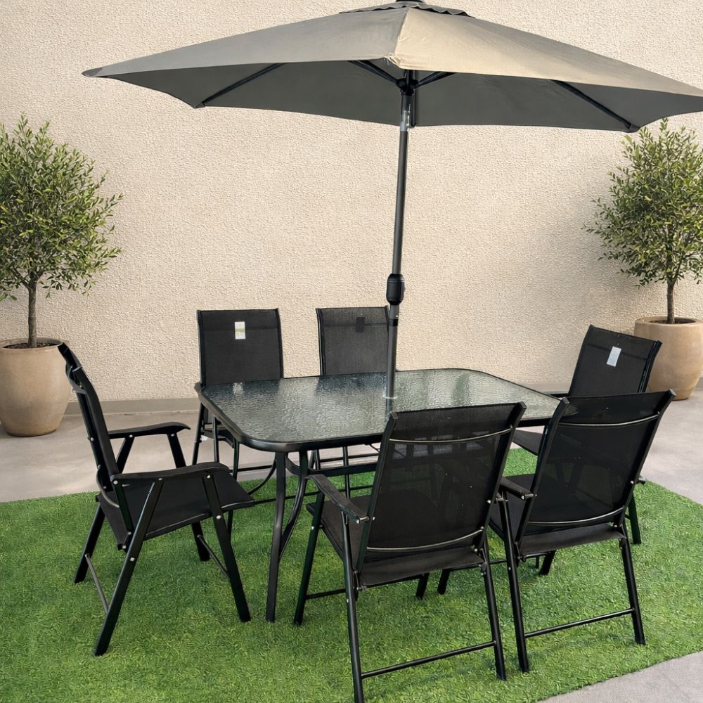 Set masă dreptunghiulară cu 6 scaune pliabile + umbrelă, metal / textilen, Negru